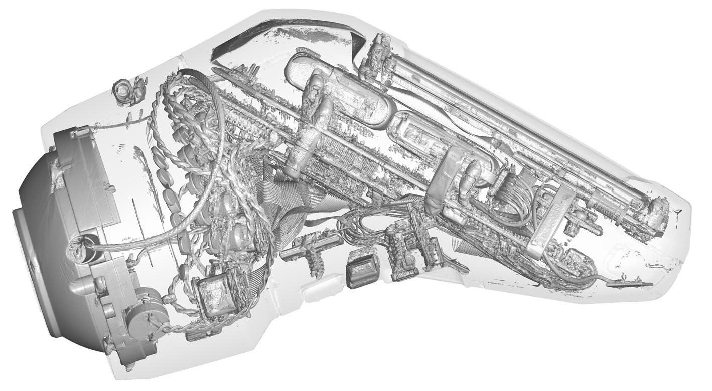 This guide’s example scan is a handheld electronic with many internal lenses and components with varying densities.